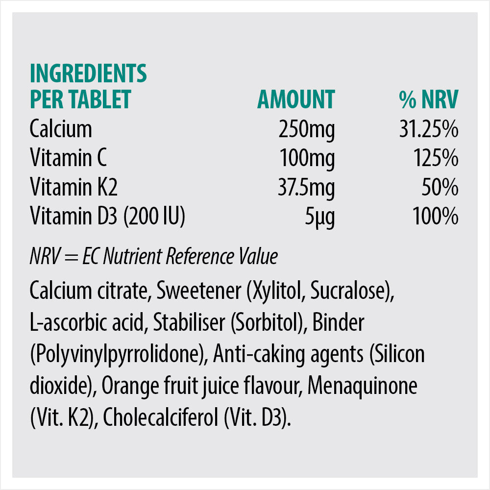 SONA CALCIUM CHEWABLE provides 250mg of Calcium with Vitamins C, K2, and D3 in each delicious, sugar-free orange flavoured chewable tablet. Combined, they support the maintenance of healthy bones & teeth, muscle function and function of digestive enzymes, the immune system and inflammatory response.